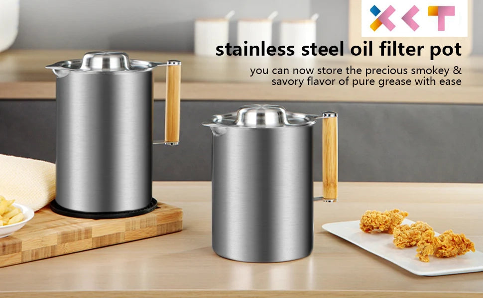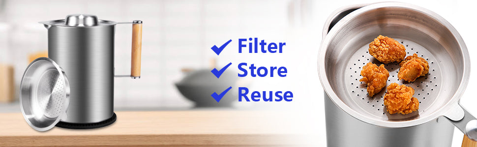 - 【Ideal Tool for Storing Oil】 --- The ergonomic wooden handle is easy to grip and comfortable, so you can easily pour the oil back into pan, skillet or deep fryer. Without worrying about the handle burning your hands that you have to wait for the pot to cool before touching it.The cover or lid can cover the pot completely to prevents debris or airborne dust particles out of oil keeping the oil clean and safe to use again.