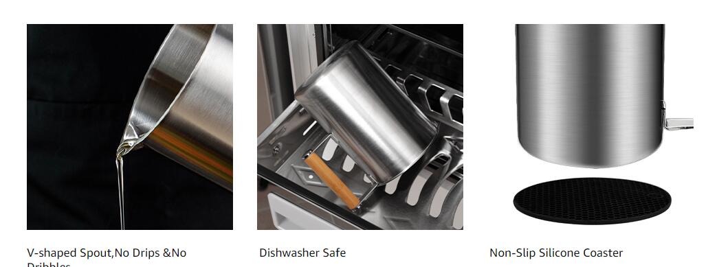 - 【Easily & Quickly】 --- The stainless steel cooking oil keeper comes with a silicone saucer to catch any drippings running down the sides, preventing oil from running on the countertop.The edge small pouring port is designed to be more rapid in the process of pouring oil, which can prevent any leakage. With the Luvan Kitchen Bacon Grease Container helps prevent messes and keeps your kitchen clean and tidy.