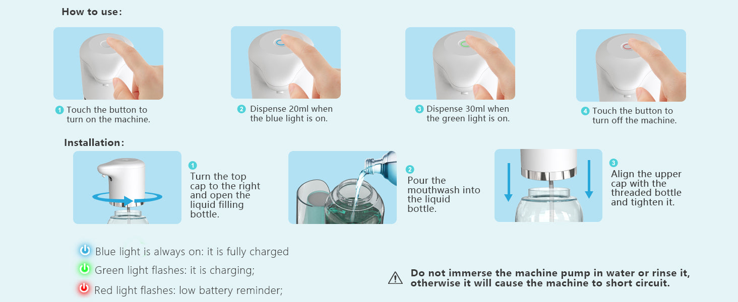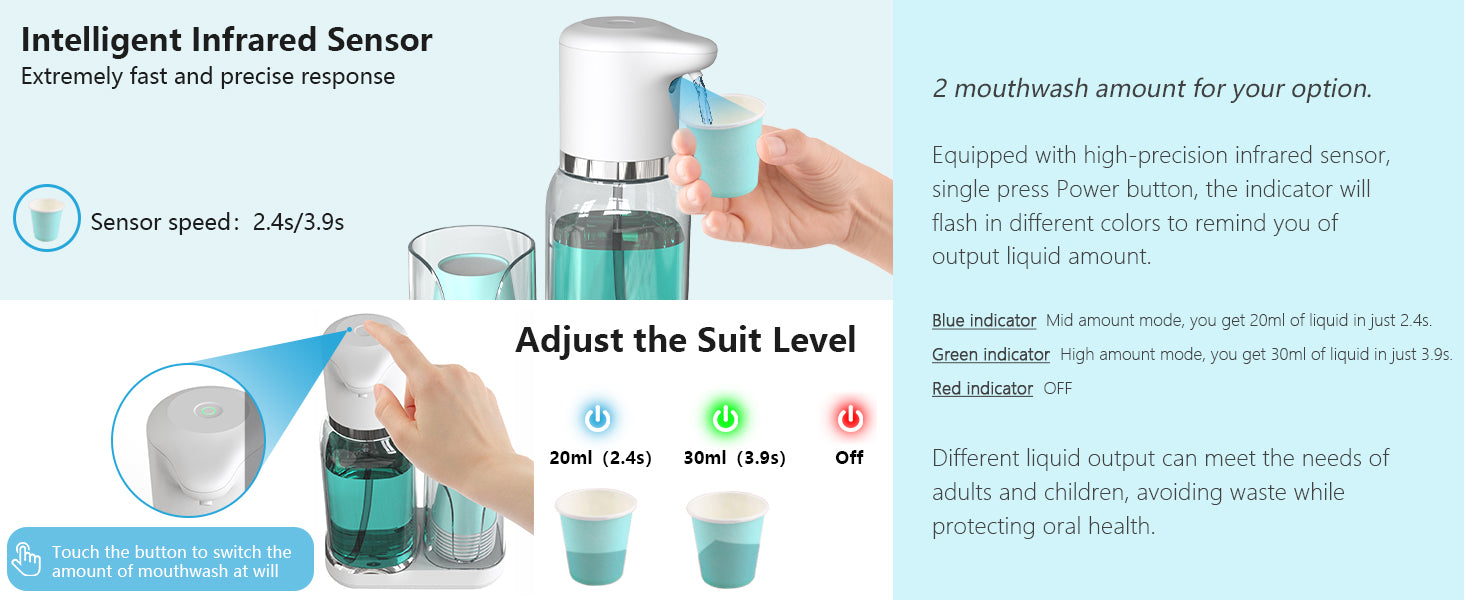 • ★Upgraded Electric Mouthwash Pump - Luvan automatic mouthwash dispenser for bathroom has built-in high-speed motor and precise infrared sensor. When you place the paper cup under the sensor and touch the small water drop button, the upgraded electric mouthwash pump will precisely sense and dispense the amount of liquid you want, minimizing clogging, waste, spills and leaks, allowing your gargle Mouth is more hygienic and relaxed.