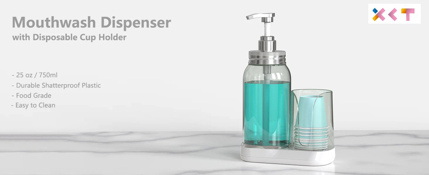 - Clear blue mouthwash pumb bottle with cup holder and 8 disposable paper cups. The paper cup dispenser's U-shaped opening and open top design make it easy to grab cups, cotton pads, kitchen sponges, and more, helping to keep your sink or countertop organized. The bottom of the container is equipped with four non-slip rubber feet to ensure its stability while protecting your countertop.
