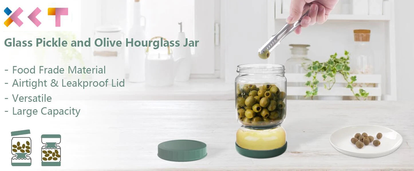 - 【HOURGLASS FLIP DESIGN】The Luvan pickle jar with strainer flip is a great addition to any kitchen.No more hands digging out pickles from the jar.Just flip it over to drain,the juice go to the bottom and you can easily get fresh pickle or olives.Make sure to tighten the lid and then flip it back over to get the pickle back into the juice while keeping them fresh and crunchy.The filter in the pickle container is made of BPA-free, food-grade soft silicone and is ready to be removed and cleaned.
