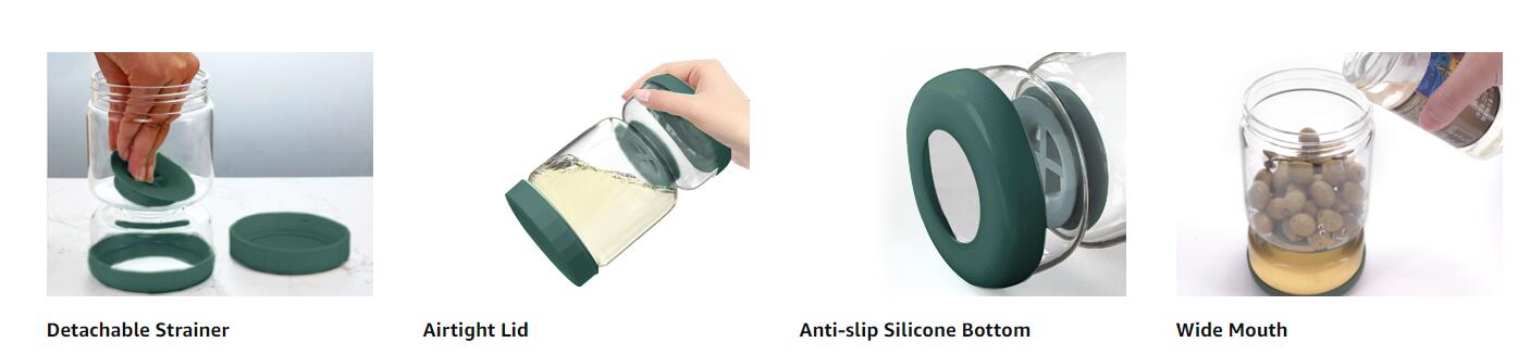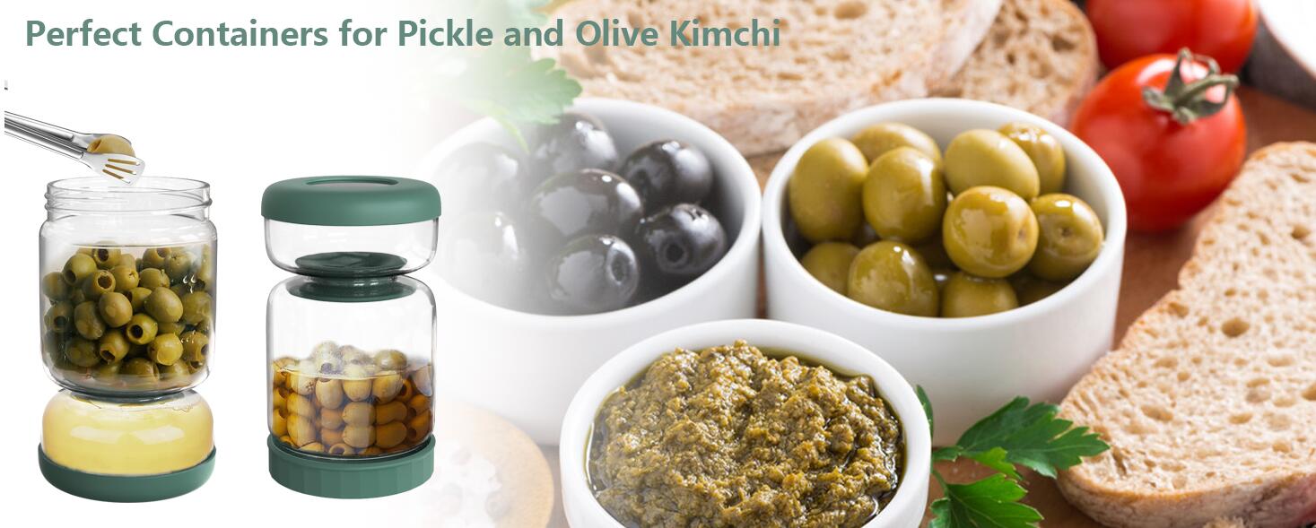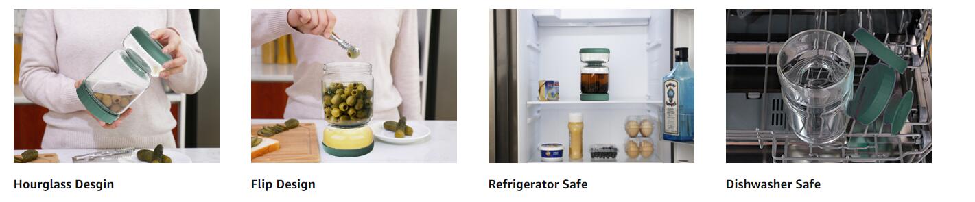 - 【UPGRADE DOUBLE LEAK-PROOF】The upgraded version of the pickle container with strainer takes a double leak-proof design. The threaded design on the inside of the lid with a silicone sealing ring ensures an airtight seal, keeping the olives tasty and fresher in the juice for longer.Making sure the lid is aligned and tightly seated before flipping means no leaks. The bottom of the pickle flip jar has a detachable non-slip base to prevent it from cracking or scratching the refrigerator shelves.