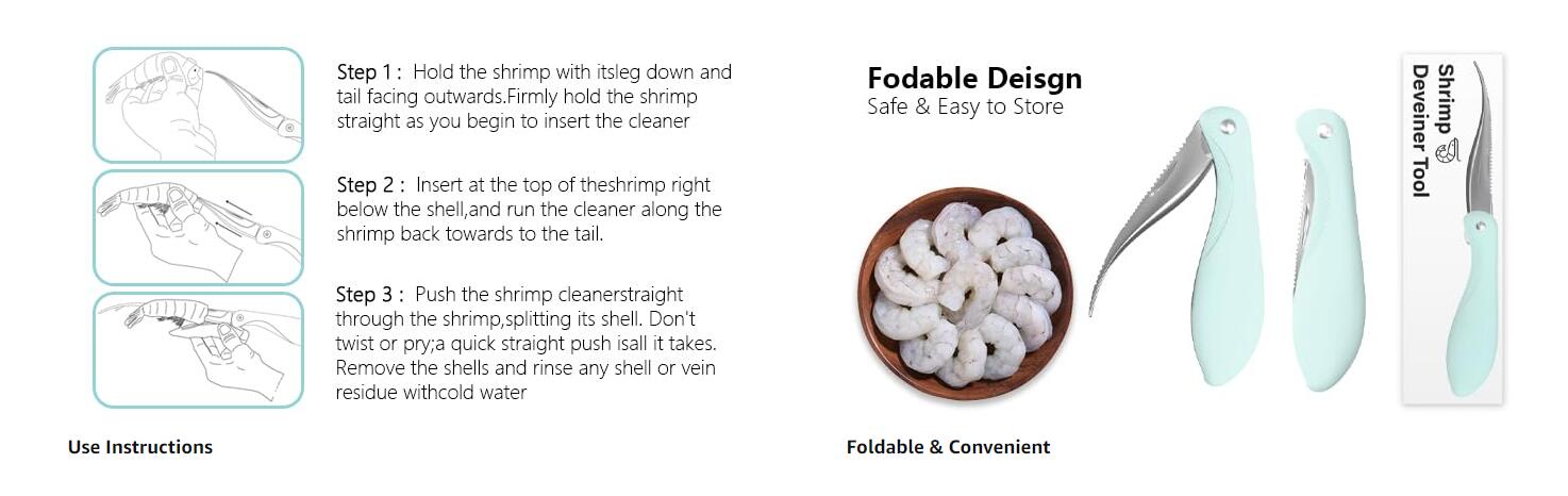 - 【Unique Design】:The shrimp peeling tool adds a paddle at the connection between the blade and the handle. The pick holds the blade in place when it is not folded. When folding, just press the paddle outward with your finger, and the blade can be easily folded away.