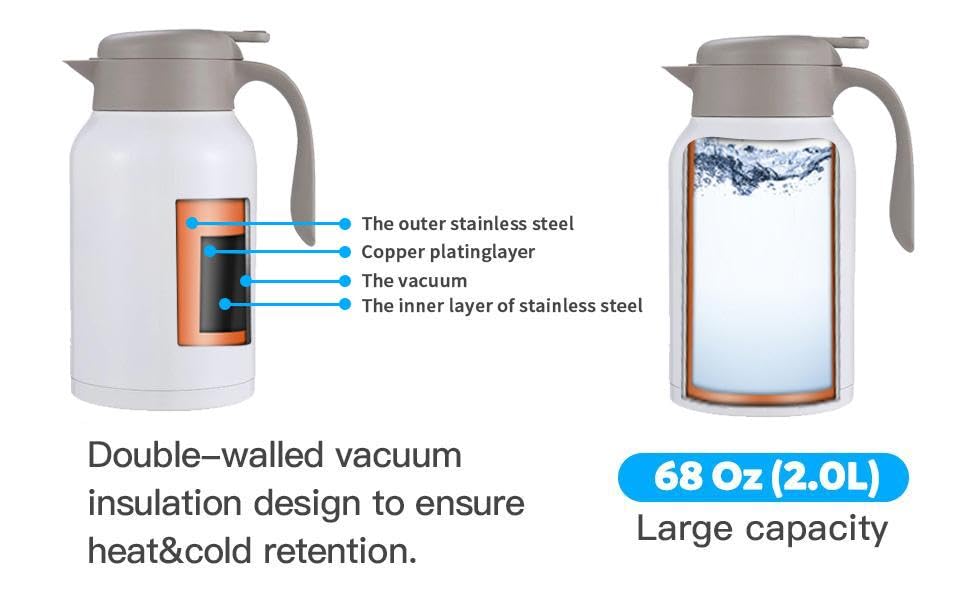 - 【 Versatile Use】 --- The thermal carafe can be used to store a many hot and cold beverages, such as coffee, tea, milk drinks, water and more. This vacuum jug is simple but elegant, as a gift for family and friends.